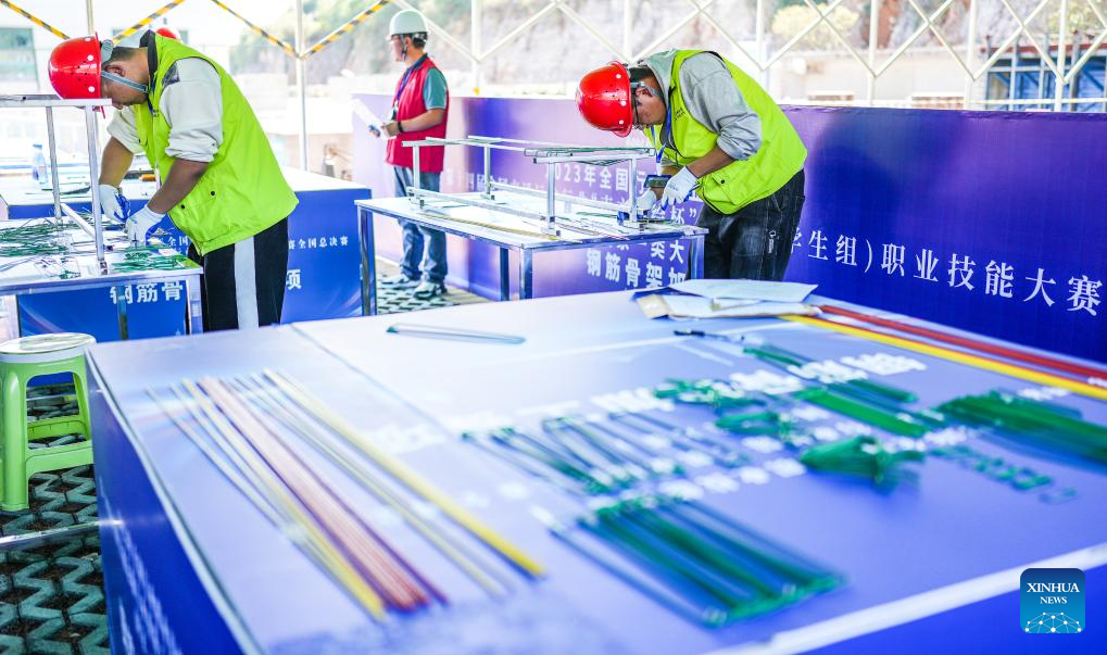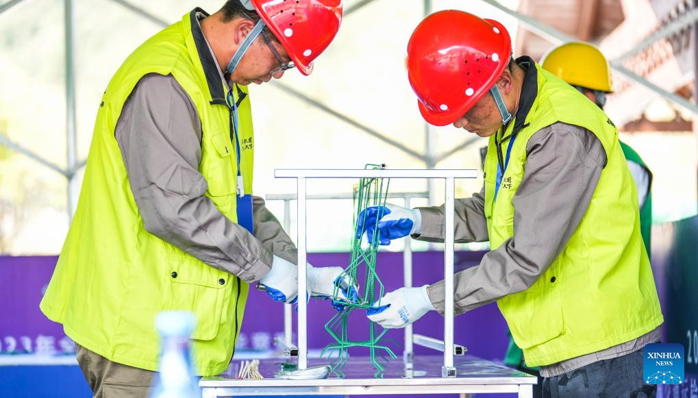 Contestants compete in processing of framework of reinforcing steel bars event during a national bridge and tunnel engineering vocational skills competition in Guiyang, southwest China's Guizhou Province, Nov. 1, 2023. A national bridge and tunnel engineering vocational skills competition kicked off here Wednesday. In total 214 contestants from 85 teams across China would compete in the four-day competition involving events like processing of framework of reinforcing steel bars and construction layout. (Xinhua/Tao Liang)
