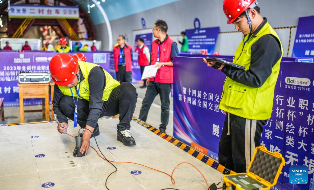 Contestants compete in tunnel lining defect non-destructive testing event during a national bridge and tunnel engineering vocational skills competition in Guiyang, southwest China's Guizhou Province, Nov. 1, 2023. A national bridge and tunnel engineering vocational skills competition kicked off here Wednesday. In total 214 contestants from 85 teams across China would compete in the four-day competition involving events like processing of framework of reinforcing steel bars and construction layout. (Xinhua/Tao Liang)