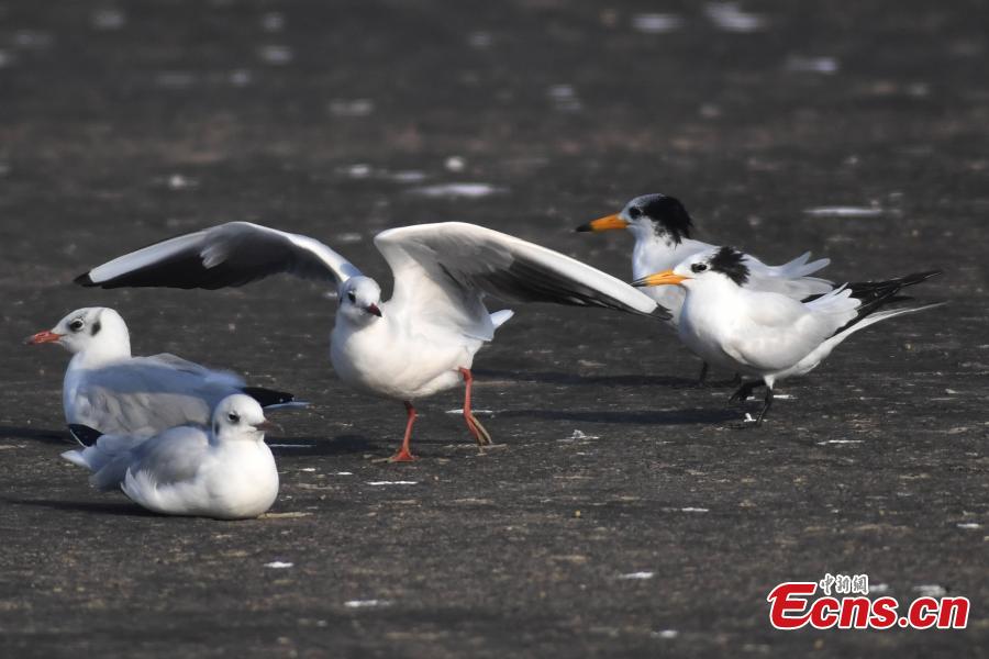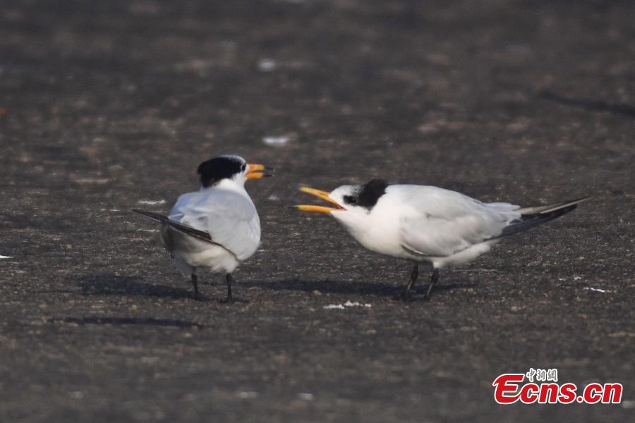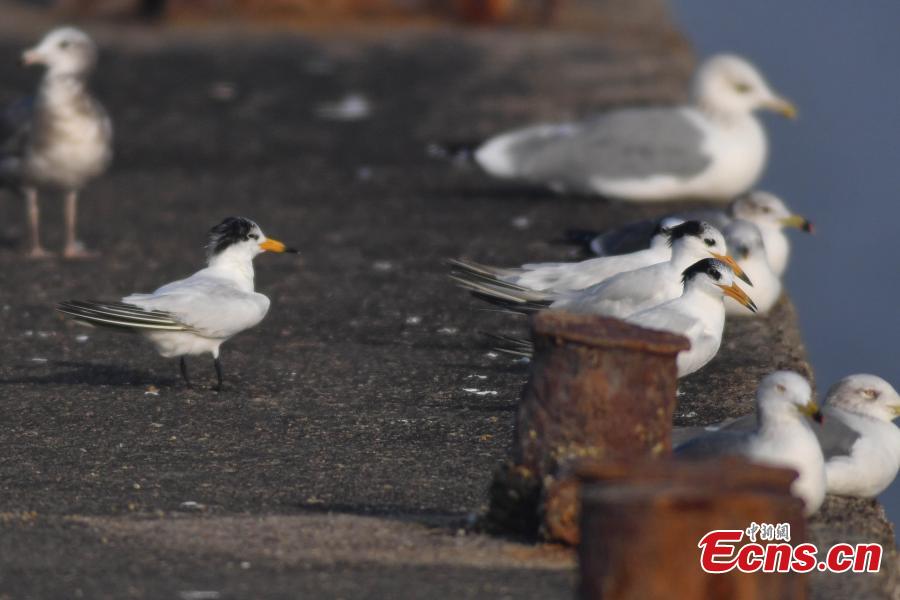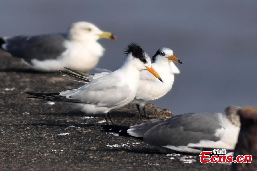 Chinese crested terns rest on the river bank in Qingdao, east China's Shandong Province, Nov. 1, 2023. (Photo: China News Service/Wang Haibin)