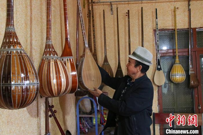 Nurdun Ismayil inspects handcrafted musical instruments on Oct. 15, 2023. (Chinanews.com/Gou Jipeng)