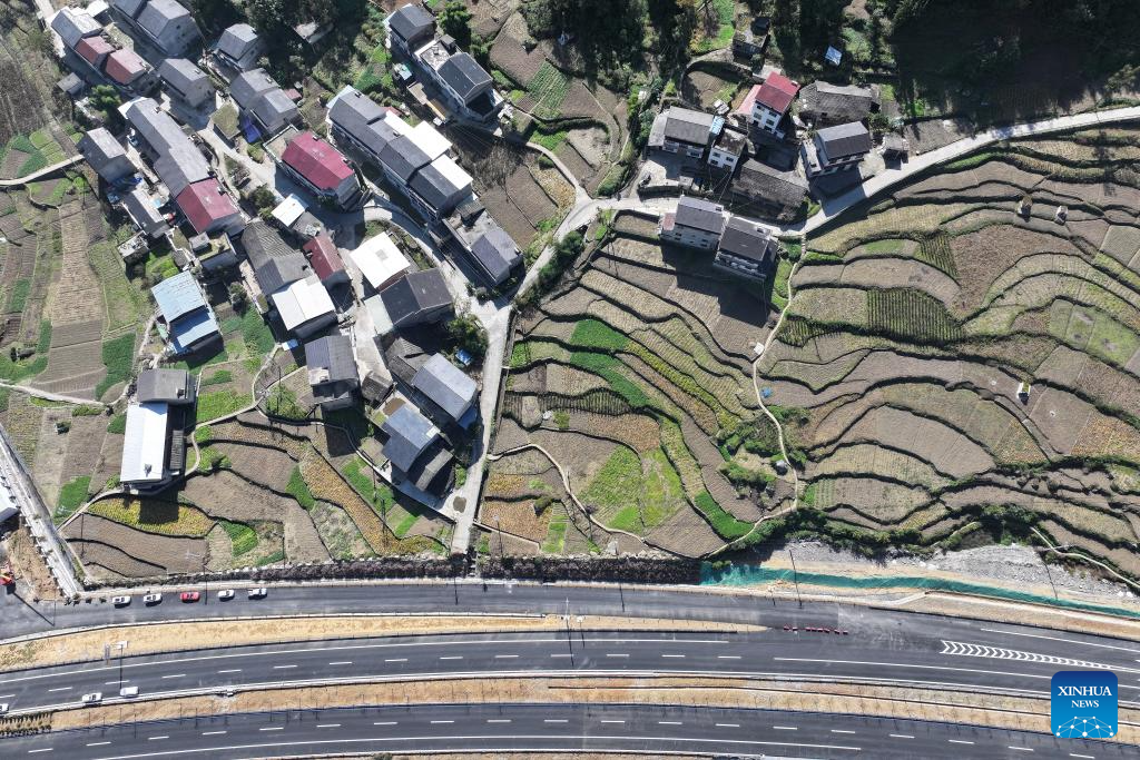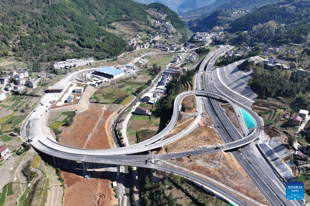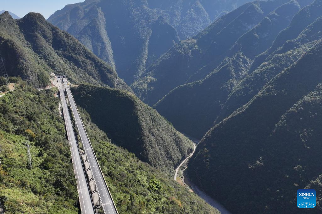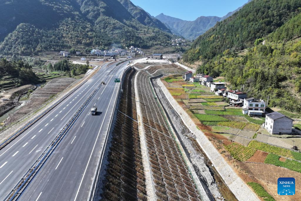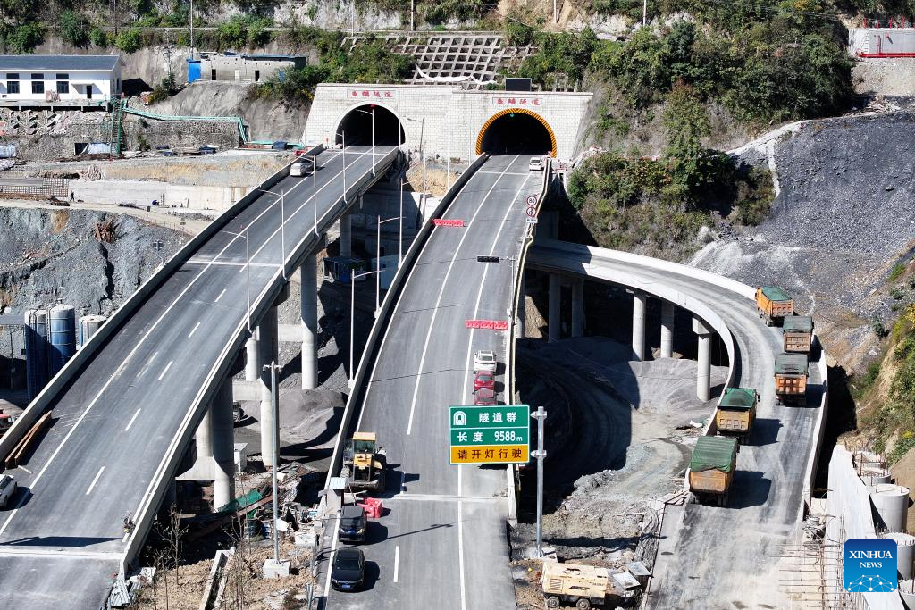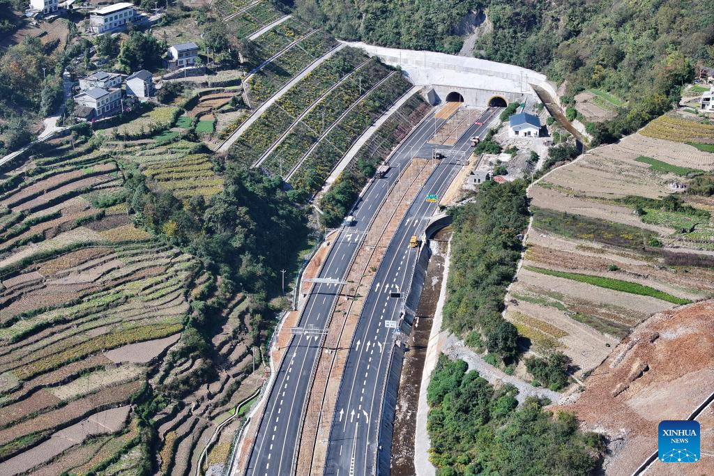This aerial photo taken on Nov. 1, 2023 shows a section of the construction site of the Wuxi-Zhenping Expressway in northwest China's Shaanxi Province. Connecting Zhenping County of Shaanxi Province with Wuxi County of Chongqing Municipality, the 48.7-kilometer Wuxi-Zhenping Expressway is expected to be officially put into operation before New Year's Day in 2024. (Xinhua/Shao Rui)