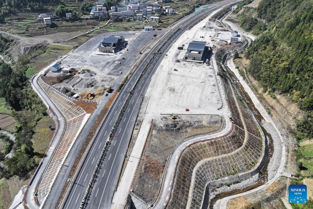 This aerial photo taken on Nov. 1, 2023 shows the construction site of a service area along the Wuxi-Zhenping Expressway in northwest China's Shaanxi Province. Connecting Zhenping County of Shaanxi Province with Wuxi County of Chongqing Municipality, the 48.7-kilometer Wuxi-Zhenping Expressway is expected to be officially put into operation before New Year's Day in 2024. (Xinhua/Shao Rui)