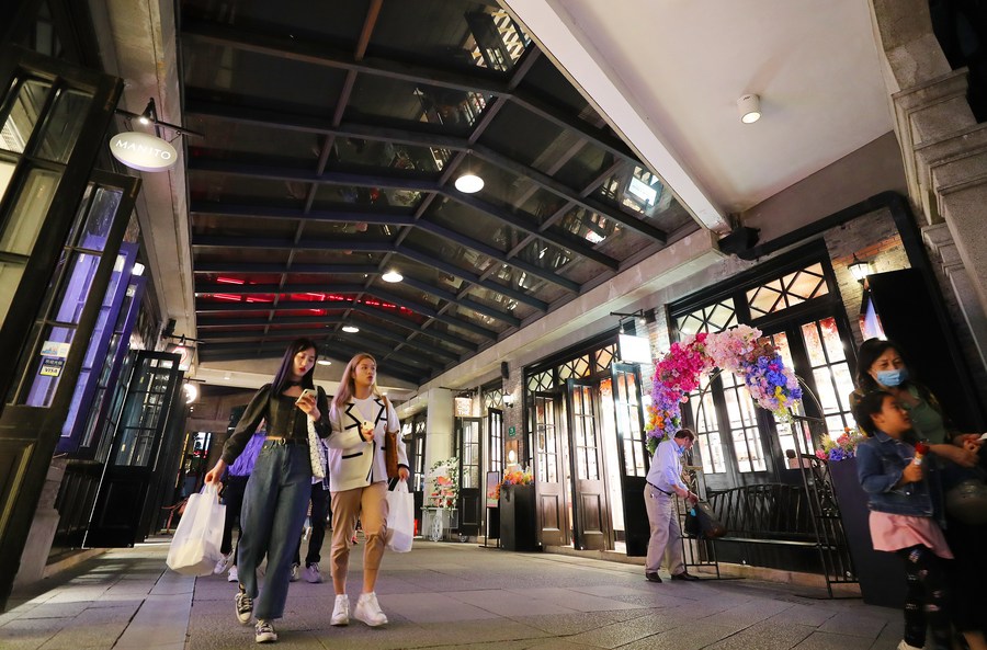 People walk on a commercial street in Shanghai, east China, Sept. 30, 2020. (Xinhua/Fang Zhe)