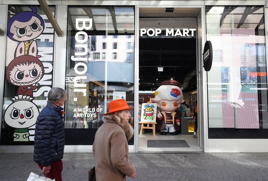 People walk past the official store of Pop Mart in Paris, France, March 1, 2023. (Xinhua/Gao Jing)