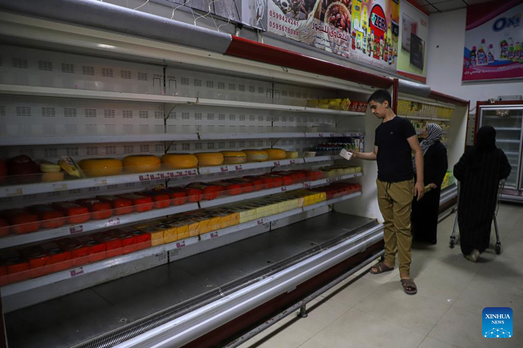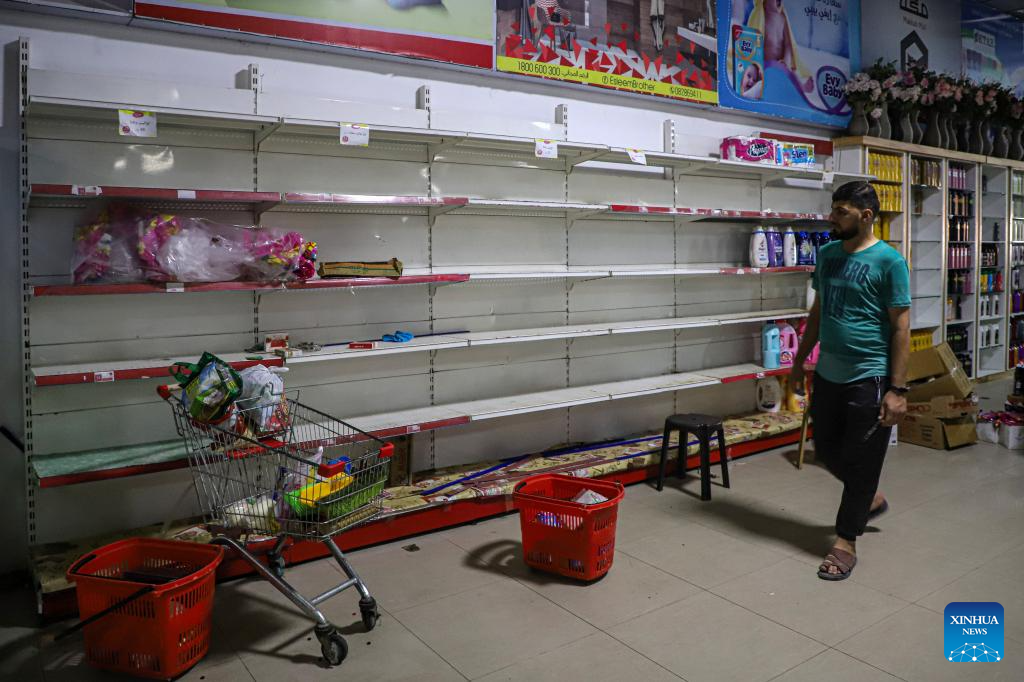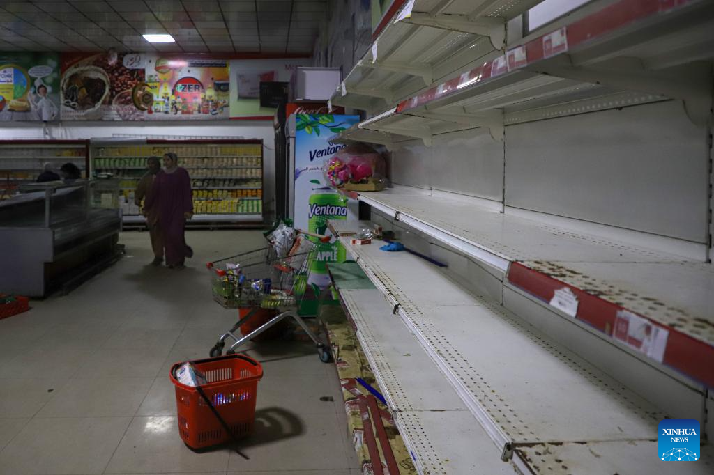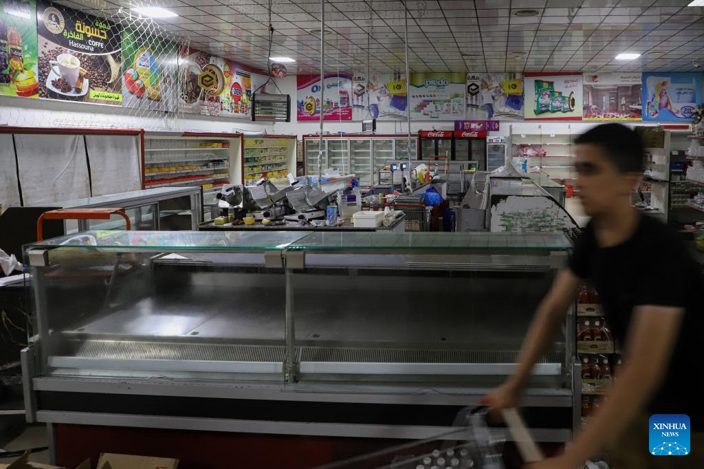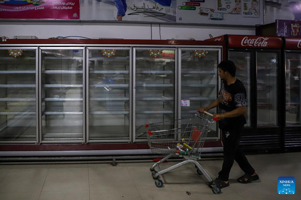 People shop at a supermarket in the southern Gaza Strip city of Khan Younis, on Nov. 2, 2023. The Palestinian Islamic Resistance Movement (Hamas) launched a surprise attack on Israel on Oct. 7, firing thousands of rockets and infiltrating Israeli territory, to which Israel responded with massive airstrikes and punitive measures, including a siege on the enclave with supplies of water, electricity, fuel, and other necessities being cut off. (Photo by Rizek Abdeljawad/Xinhua)