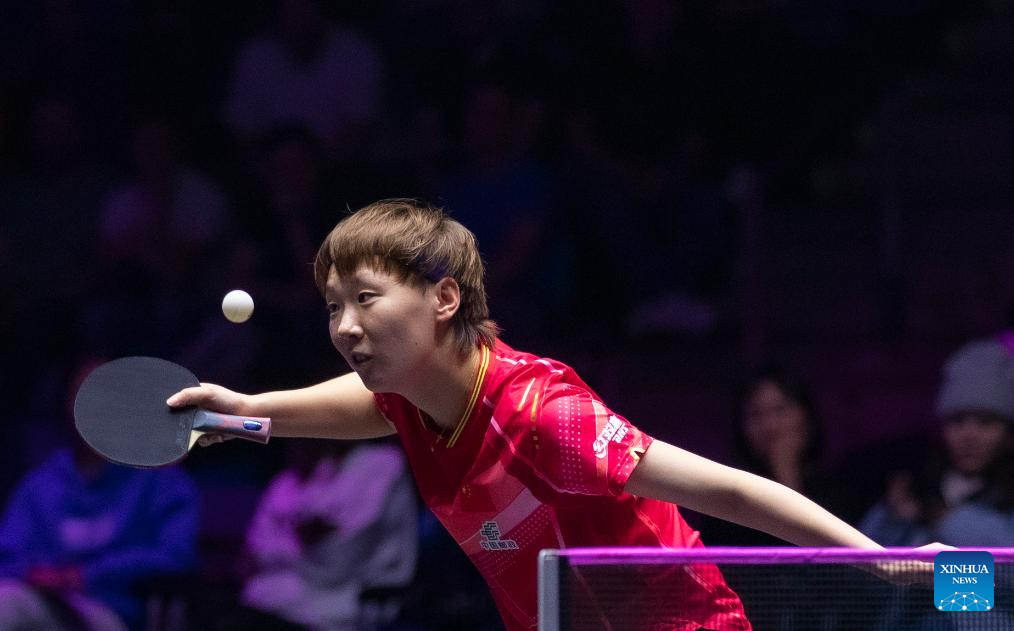 Wang Yidi of China hits a return during the women's singles round of 16 match against Manika Batra of India at the WTT Champions Frankfurt 2023 in Frankfurt, Germany, Nov. 2, 2023. (Xinhua/Zhang Fan)