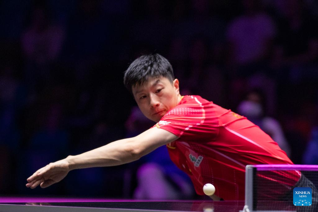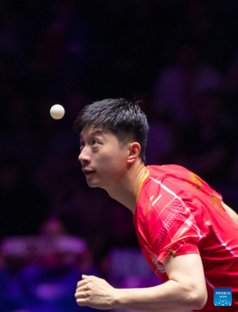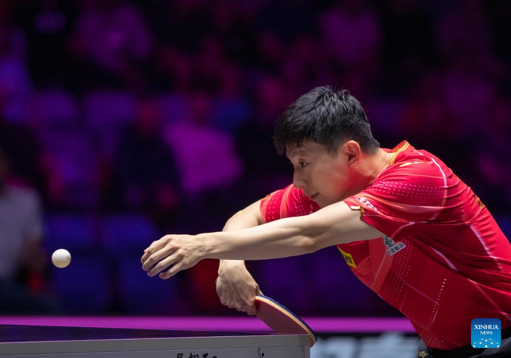 Ma Long of China hits a return during the men's singles round of 16 match against Omar Assar of Egypt at the WTT Champions Frankfurt 2023 in Frankfurt, Germany, Nov. 2, 2023. (Xinhua/Zhang Fan)