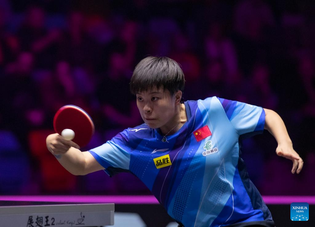 Wang Manyu of China hits a return during the women's singles round of 16 match against Yuan Jianan of France at the WTT Champions Frankfurt 2023 in Frankfurt, Germany, Nov. 2, 2023. (Xinhua/Zhang Fan)
