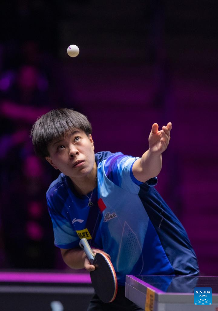 Wang Yidi of China serves during the women's singles round of 16 match against Manika Batra of India at the WTT Champions Frankfurt 2023 in Frankfurt, Germany, Nov. 2, 2023. (Xinhua/Zhang Fan)