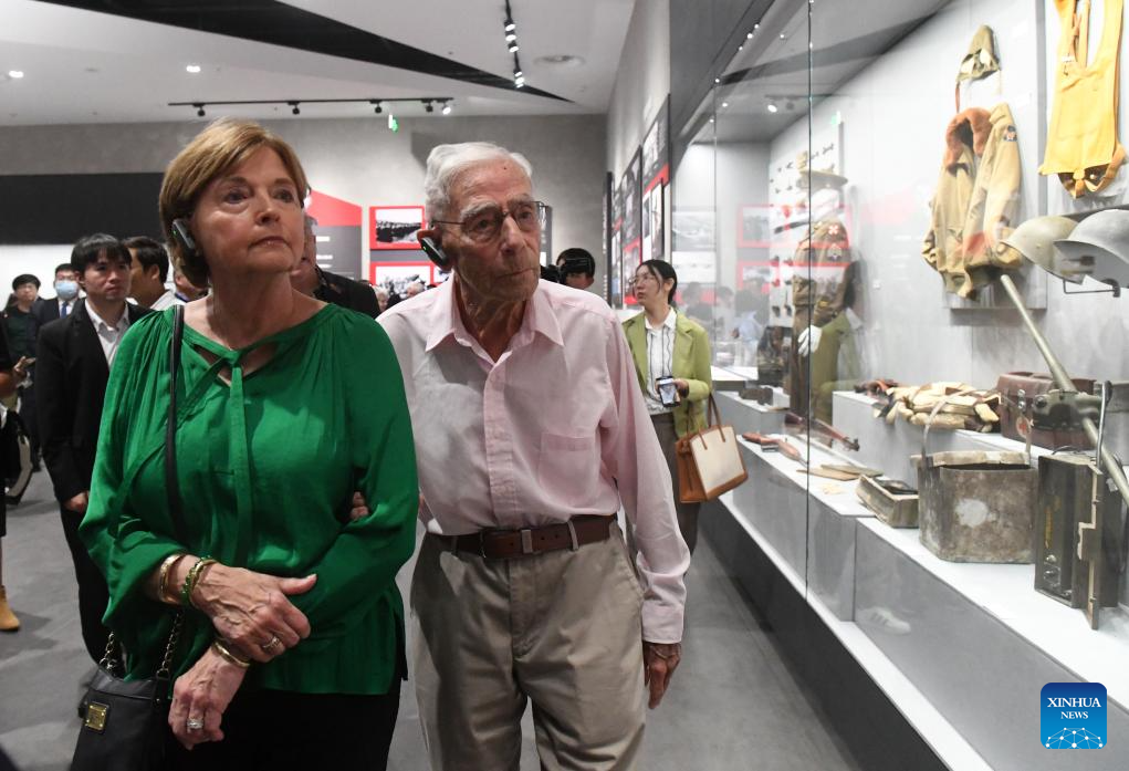 Nell Chennault Calloway (L), granddaughter of U.S. General Claire Lee Chennault, who led the wartime Flying Tigers pilots to fight Japanese invaders in China during WWII, and Flying Tigers veteran Harry Moyer visit a history museum of the resistance war against Japanese aggression in Liuzhou, south China's Guangxi Zhuang Autonomous Region, Nov. 4, 2023. Jeffrey Greene, chairman of the Sino-American Aviation Heritage Foundation, and Flying Tigers veterans and descendants arrived in Liuzhou on Saturday for a two-day visit. (Xinhua/Lu Boan)