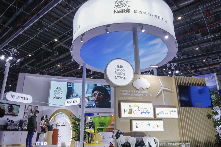 This photo taken on Nov. 9, 2021 shows the booth of Nestle at the 4th China International Import Expo (CIIE) in east China's Shanghai. (Xinhua/Zhang Yuwei)