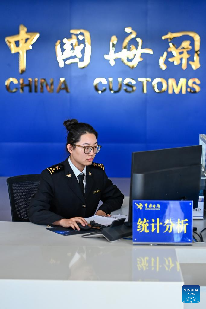A customs officer works at a service hall in Kashgar Prefecture, northwest China's Xinjiang Uygur Autonomous Region, Nov. 4, 2023. (Xinhua/Ding Lei)