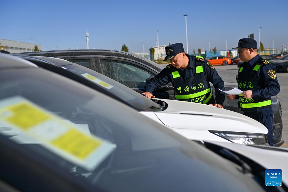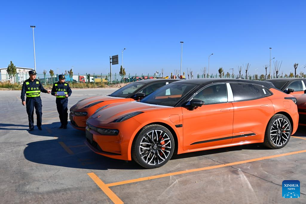 Customs officers check exported vehicles in the comprehensive bonded zone in Kashgar Prefecture, northwest China's Xinjiang Uygur Autonomous Region, Nov. 4, 2023. (Xinhua/Ding Lei)