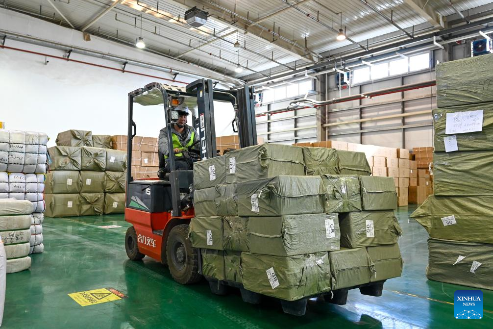 A staff member loads exported goods at a logistics center in the comprehensive bonded zone in Kashgar Prefecture, northwest China's Xinjiang Uygur Autonomous Region, Nov. 4, 2023. (Xinhua/Ding Lei)