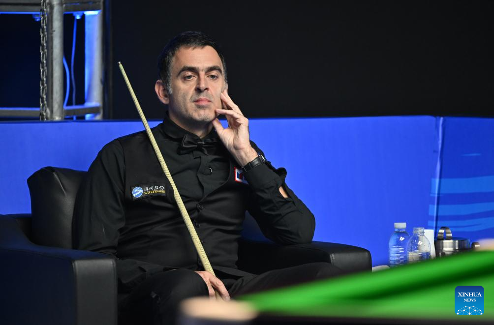 Ronnie O'Sullivan of England reacts during the round 1 match between Ronnie O'Sullivan of England and Ken Doherty of Ireland at World Snooker International Championship 2023 in north China's Tianjin Municipality, Nov. 5, 2023. (Xinhua/Li Ran)