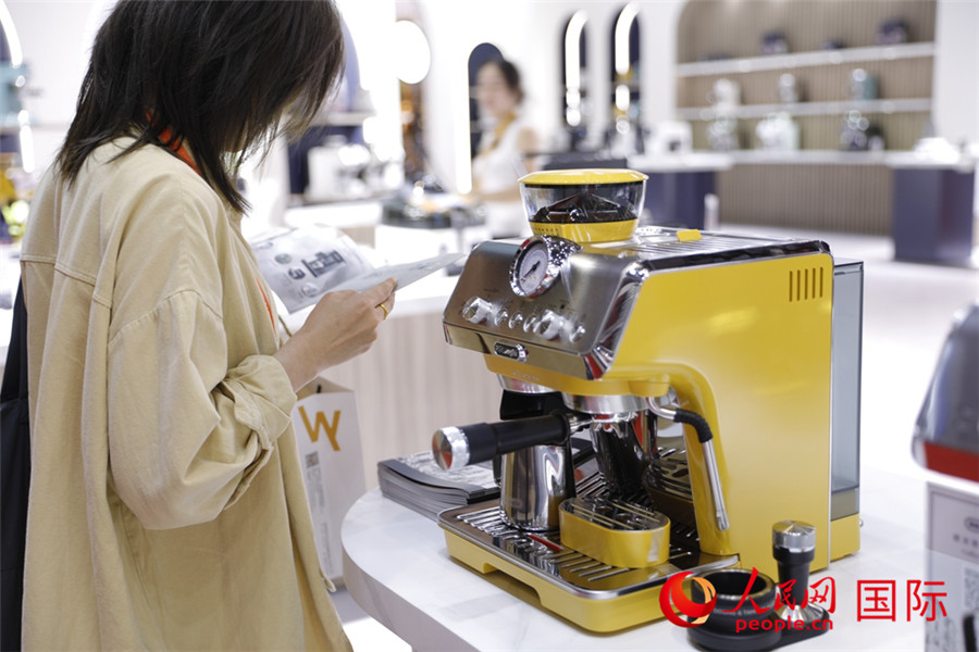 Photo taken on Nov. 5 shows a visitor examining the features of a coffee machine in the consumer goods section of the 6th China International Import Expo in Shanghai. (People's Daily Online/Li Meiyu)