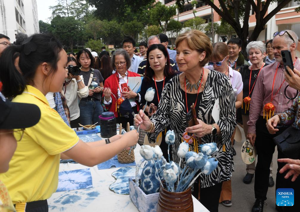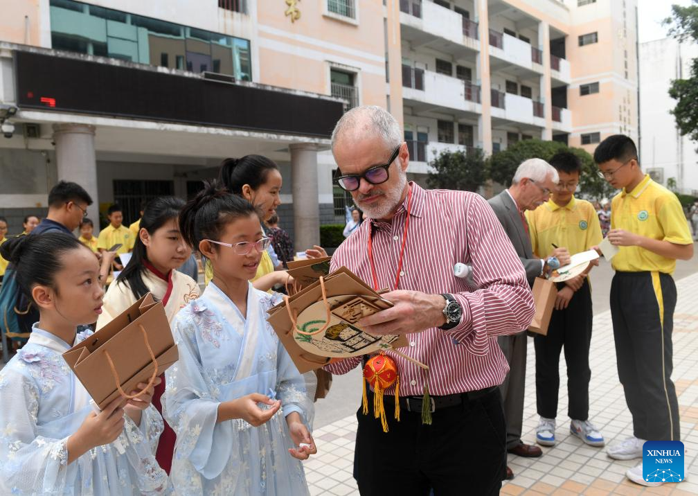 Delegation members visit a middle school in Liuzhou, south China's Guangxi Zhuang Autonomous Region, Nov. 5, 2023. A delegation including Jeffrey Greene, chairman of the Sino-American Aviation Heritage Foundation, and Flying Tigers veterans and their descendants, visited Liuzhou on Sunday. (Xinhua/Lu Boan)