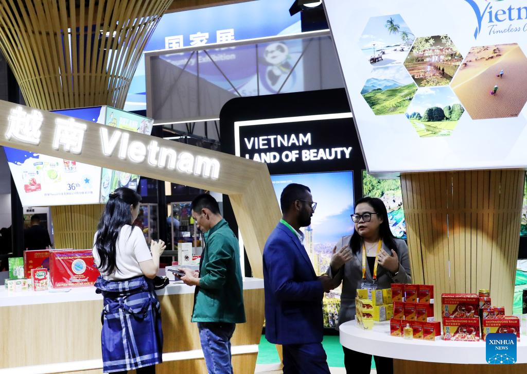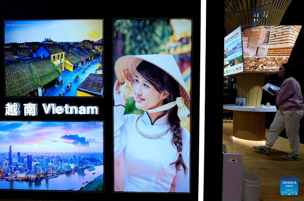 The booth of Vietnam is seen at the 6th China International Import Expo (CIIE) in east China's Shanghai, Nov. 6, 2023. The 6th China International Import Expo is held here from Nov. 5 to 10, with Honduras, Serbia, Vietnam, South Africa and Kazakhstan as its five guest countries of honor. (Xinhua/Zhang Jiansong)