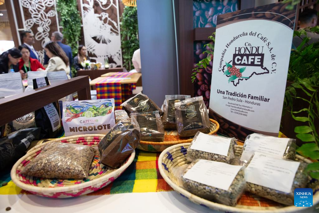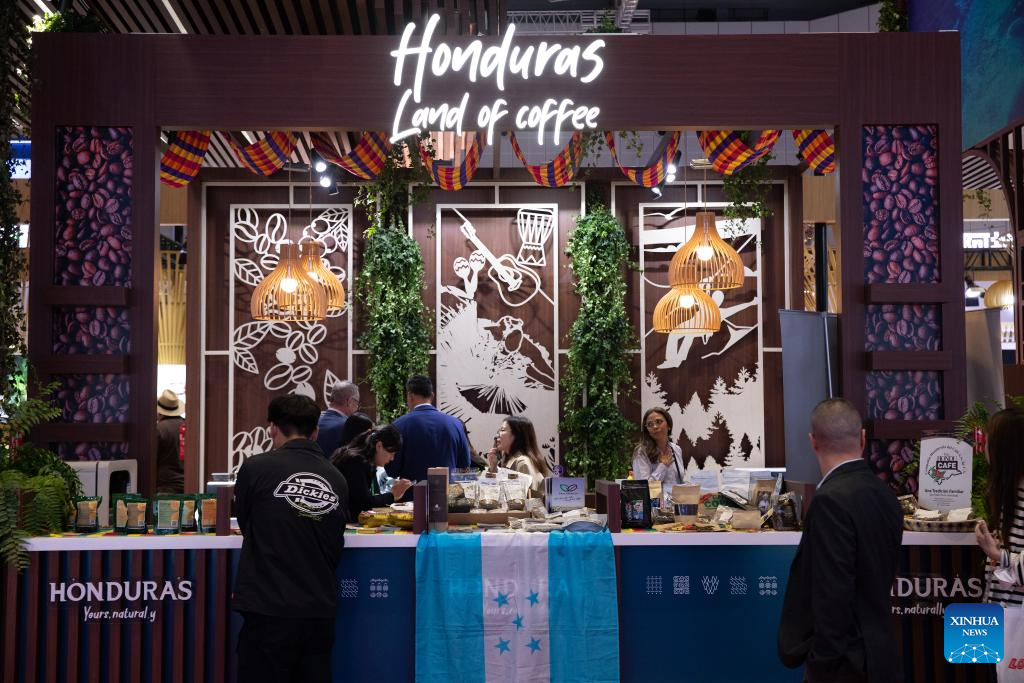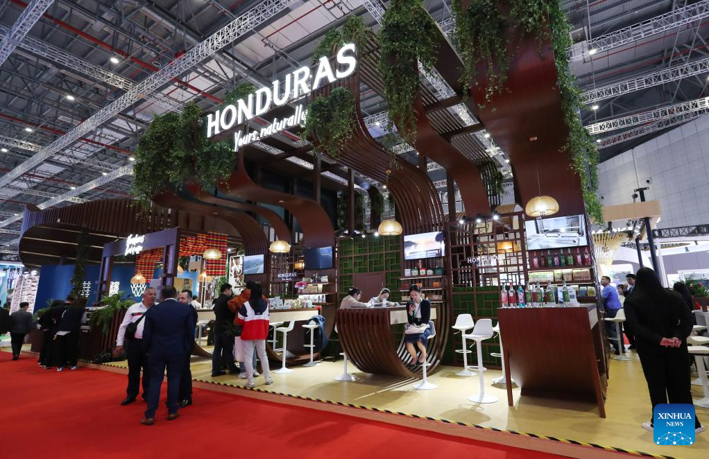 People visit the booth of Honduras at the 6th China International Import Expo (CIIE) in east China's Shanghai, Nov. 6, 2023. The 6th China International Import Expo is held here from Nov. 5 to 10, with Honduras, Serbia, Vietnam, South Africa and Kazakhstan as its five guest countries of honor. (Xinhua/Fang Zhe)