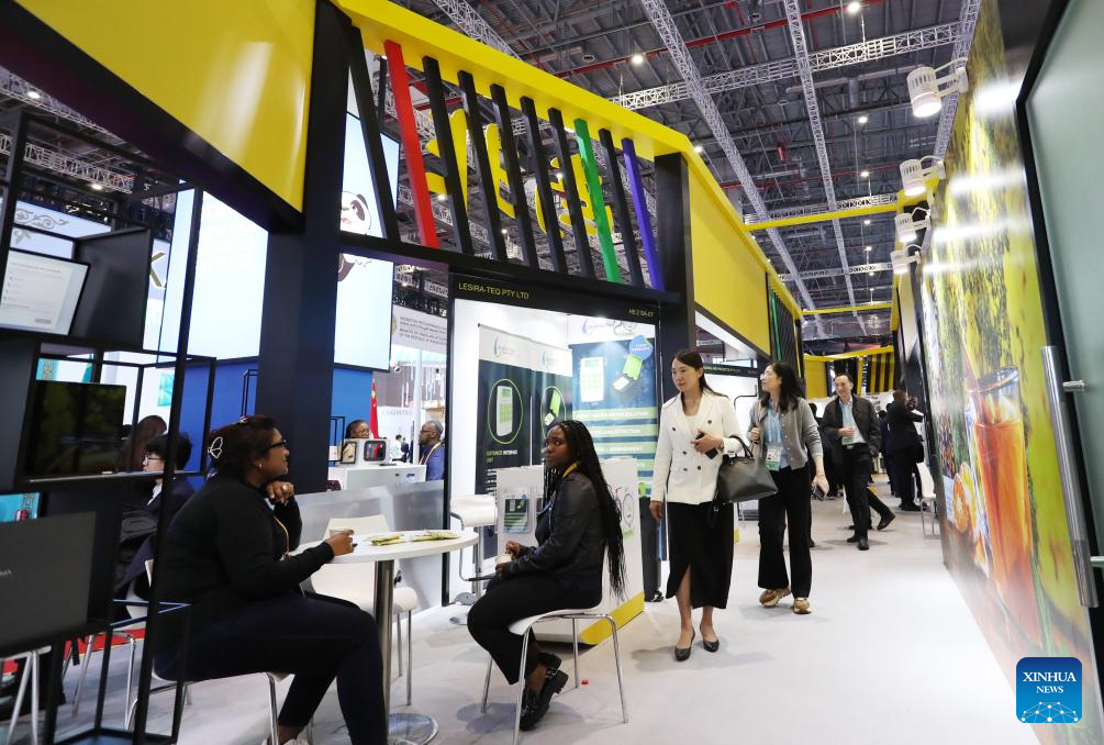 People visit the booth of South Africa at the 6th China International Import Expo (CIIE) in east China's Shanghai, Nov. 6, 2023. The 6th China International Import Expo is held here from Nov. 5 to 10, with Honduras, Serbia, Vietnam, South Africa and Kazakhstan as its five guest countries of honor. (Xinhua/Fang Zhe)