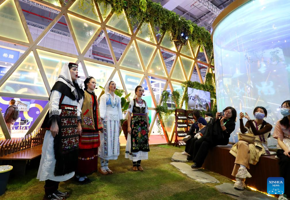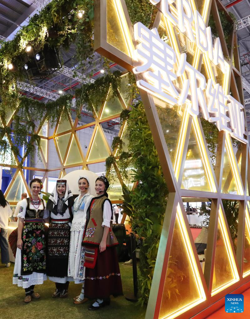 Performers are seen at the booth of Serbia at the 6th China International Import Expo (CIIE) in east China's Shanghai, Nov. 6, 2023. The 6th China International Import Expo is held here from Nov. 5 to 10, with Honduras, Serbia, Vietnam, South Africa and Kazakhstan as its five guest countries of honor. (Xinhua/Fang Zhe)