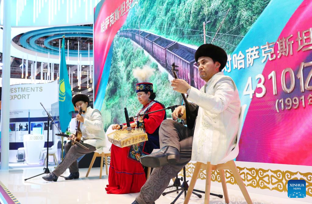 Performers play musical instruments at the booth of Kazakhstan at the 6th China International Import Expo (CIIE) in east China's Shanghai, Nov. 6, 2023. The 6th China International Import Expo is held here from Nov. 5 to 10, with Honduras, Serbia, Vietnam, South Africa and Kazakhstan as its five guest countries of honor. (Xinhua/Fang Zhe)