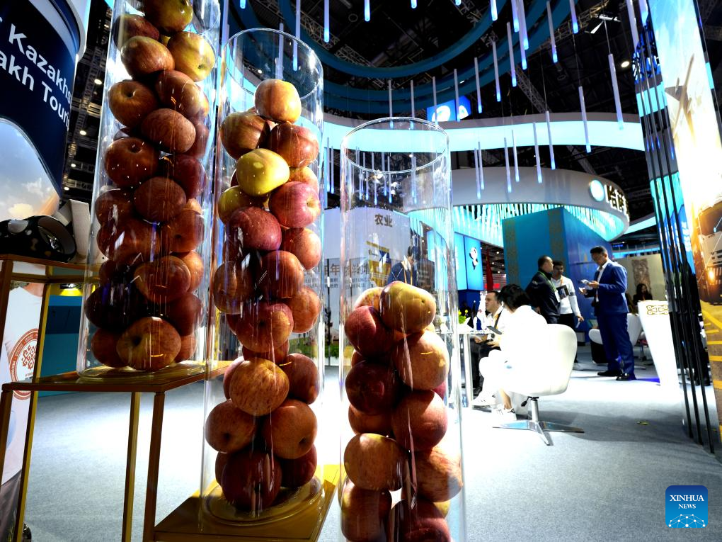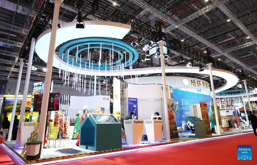 The booth of Kazakhstan is seen at the 6th China International Import Expo (CIIE) in east China's Shanghai, Nov. 6, 2023. The 6th China International Import Expo is held here from Nov. 5 to 10, with Honduras, Serbia, Vietnam, South Africa and Kazakhstan as its five guest countries of honor. (Xinhua/Fang Zhe)