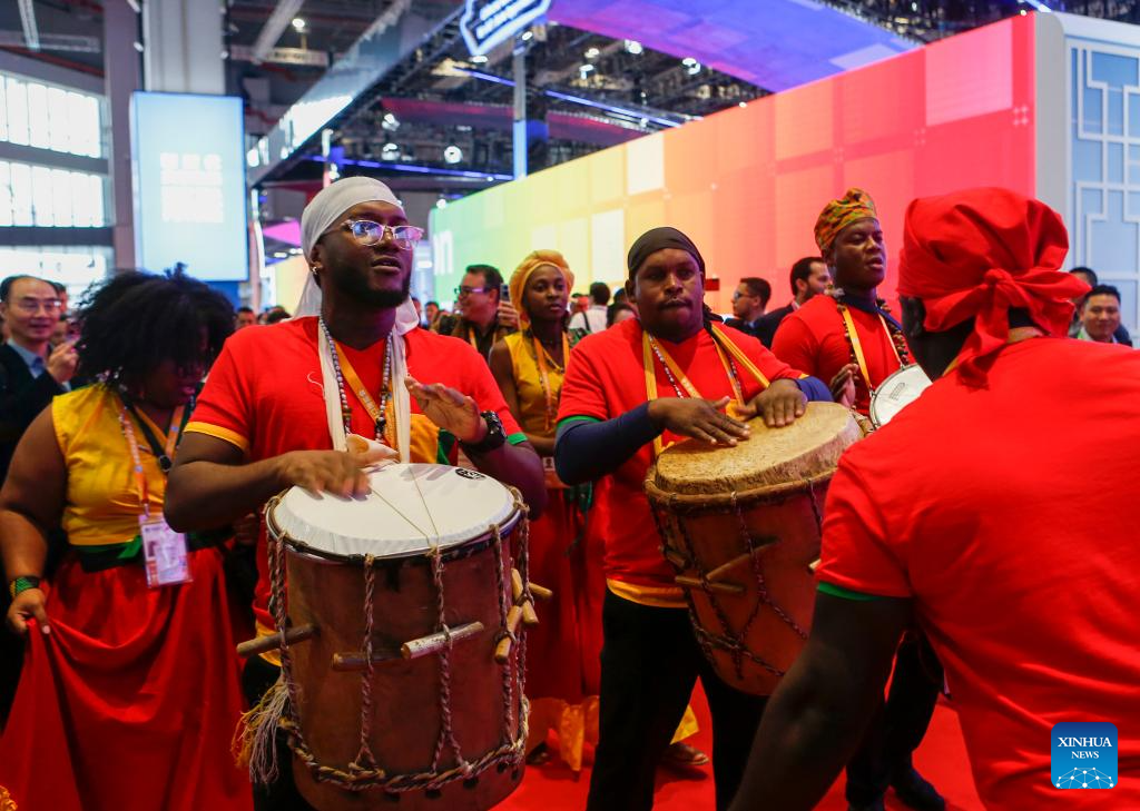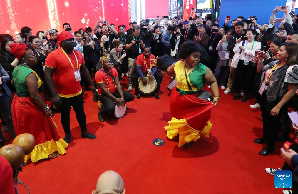Performers from the booth of Honduras stage a show at the 6th China International Import Expo (CIIE) in east China's Shanghai, Nov. 6, 2023. The 6th China International Import Expo is held here from Nov. 5 to 10, with Honduras, Serbia, Vietnam, South Africa and Kazakhstan as its five guest countries of honor. (Xinhua/Fang Zhe)
