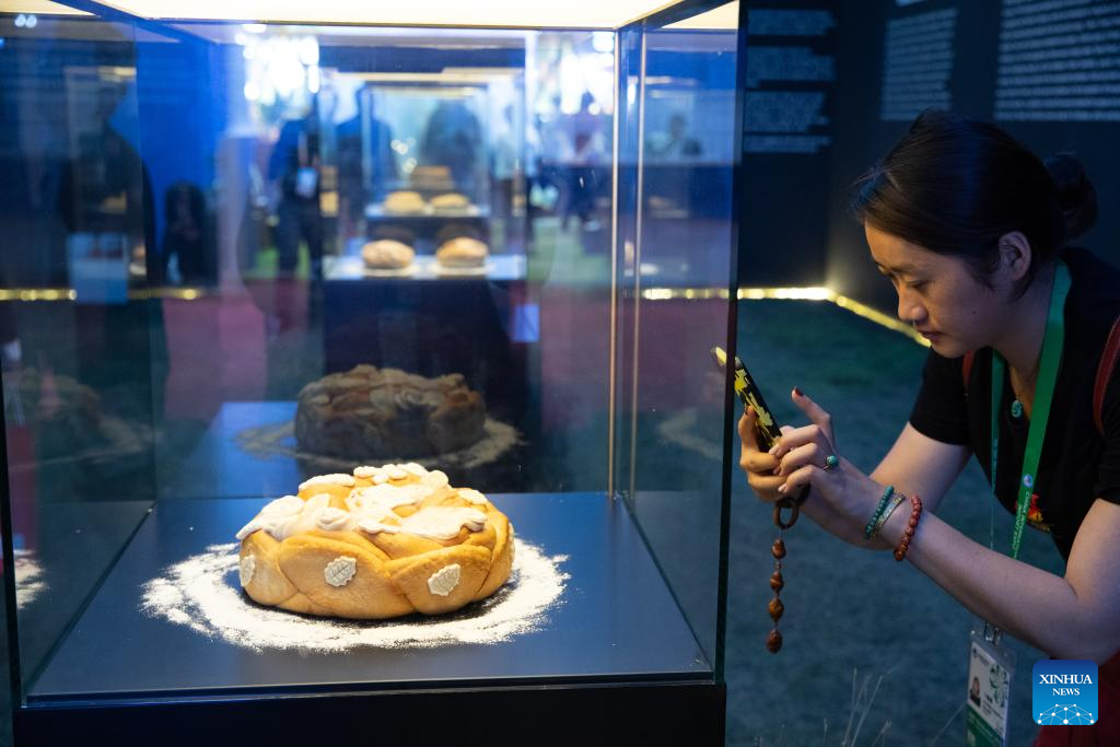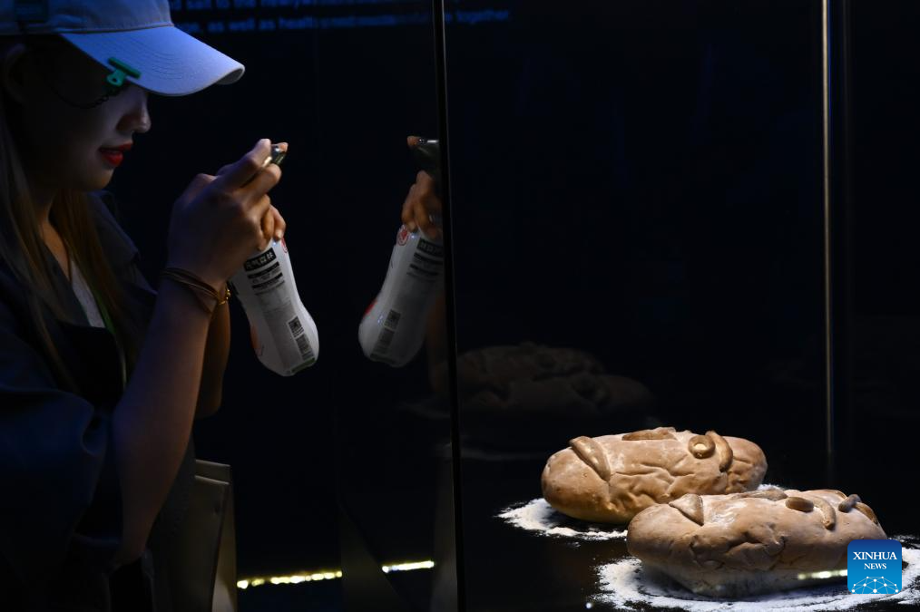 A visitor takes photos of Serbian bread displayed at the booth of Serbia at the 6th China International Import Expo (CIIE) in east China's Shanghai, Nov. 6, 2023. The 6th China International Import Expo is held here from Nov. 5 to 10, with Honduras, Serbia, Vietnam, South Africa and Kazakhstan as its five guest countries of honor. (Xinhua/Jin Liwang)
