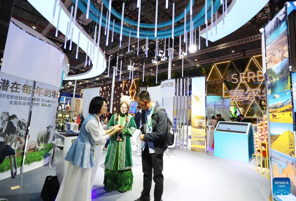 People visit the booth of Serbia at the 6th China International Import Expo (CIIE) in east China's Shanghai, Nov. 6, 2023. The 6th China International Import Expo is held here from Nov. 5 to 10, with Honduras, Serbia, Vietnam, South Africa and Kazakhstan as its five guest countries of honor. (Xinhua/Li Mengjiao)