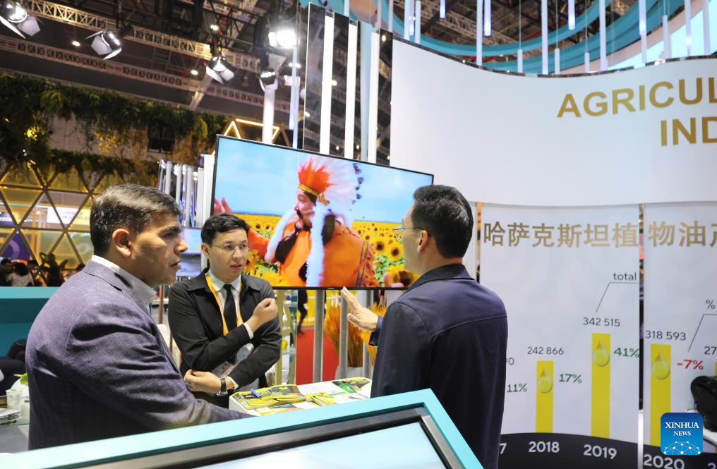 A visitor (R) talks with staff members at the booth of Kazakhstan at the 6th China International Import Expo (CIIE) in east China's Shanghai, Nov. 6, 2023. The 6th China International Import Expo is held here from Nov. 5 to 10, with Honduras, Serbia, Vietnam, South Africa and Kazakhstan as its five guest countries of honor. (Xinhua/Fang Zhe)
