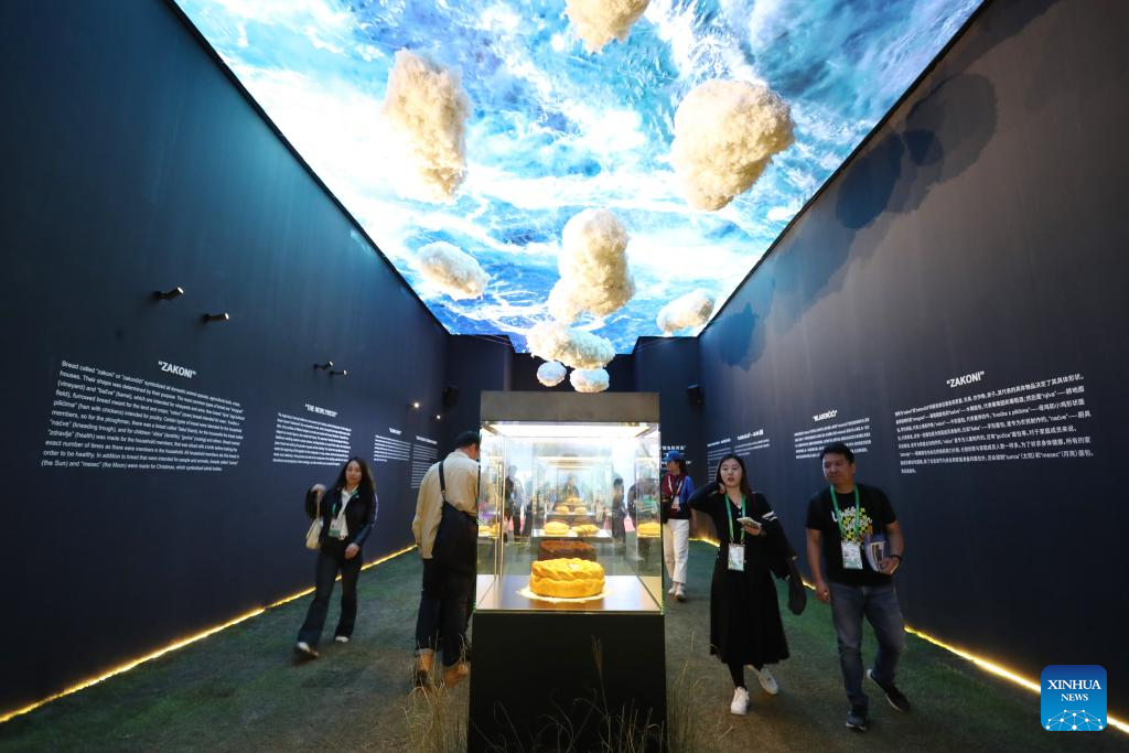 A visitor takes photos of Serbian bread displayed at the booth of Serbia at the 6th China International Import Expo (CIIE) in east China's Shanghai, Nov. 6, 2023. The 6th China International Import Expo is held here from Nov. 5 to 10, with Honduras, Serbia, Vietnam, South Africa and Kazakhstan as its five guest countries of honor. (Xinhua/Jin Liangkuai)
