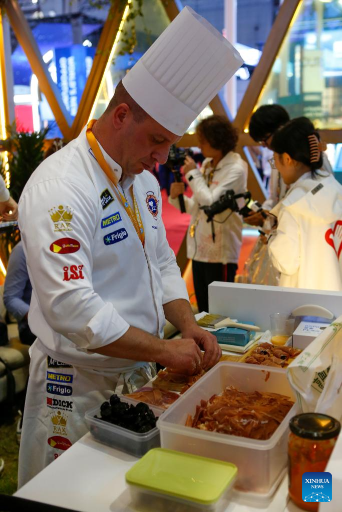 A staff member makes Serbian food at the 6th China International Import Expo (CIIE) in east China's Shanghai, Nov. 6, 2023. The 6th China International Import Expo is held here from Nov. 5 to 10, with Honduras, Serbia, Vietnam, South Africa and Kazakhstan as its five guest countries of honor. (Xinhua/Chen Shuo)