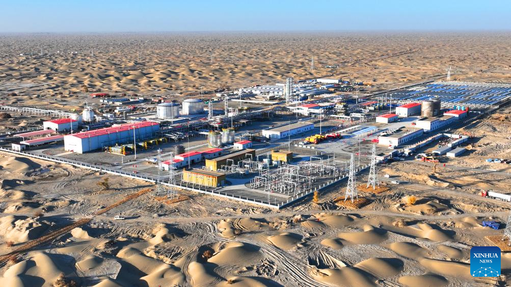 This aerial photo taken on Nov. 4, 2023 shows a major gas and oil processing station in the Fuman oilfield in northwest China's Xinjiang Uygur Autonomous Region. (Photo by Chen Shibing/Xinhua)