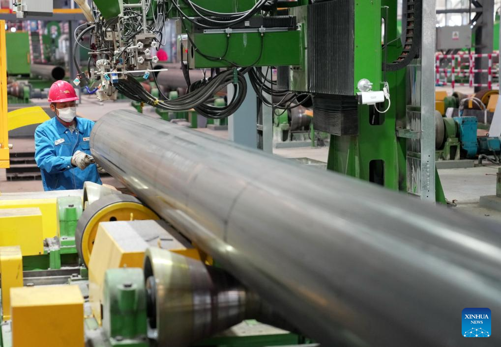 A man works on the production line of a steel pipe manufacturing company in the Qinhuangdao Economic and Technological Development Zone, north China's Hebei Province, Nov. 5, 2023.?(Xinhua/Yang Shiyao)