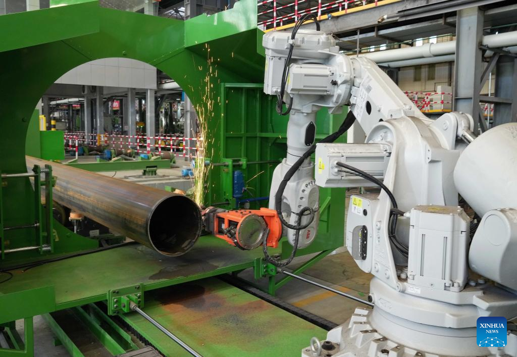 Intelligent mechanical equipment operates on a production line of a steel pipe manufacturing company in the Qinhuangdao Economic and Technological Development Zone, north China's Hebei Province, Nov. 5, 2023. (Xinhua/Yang Shiyao)