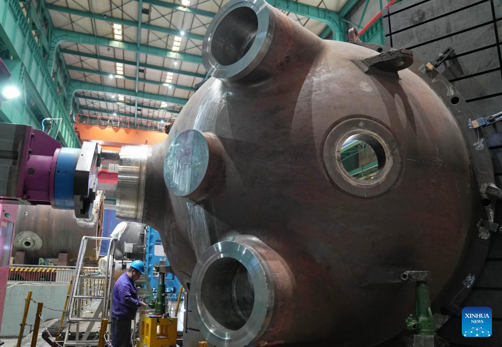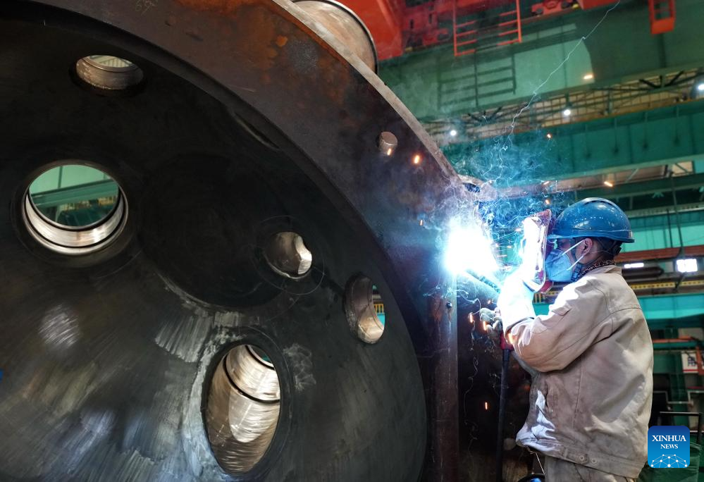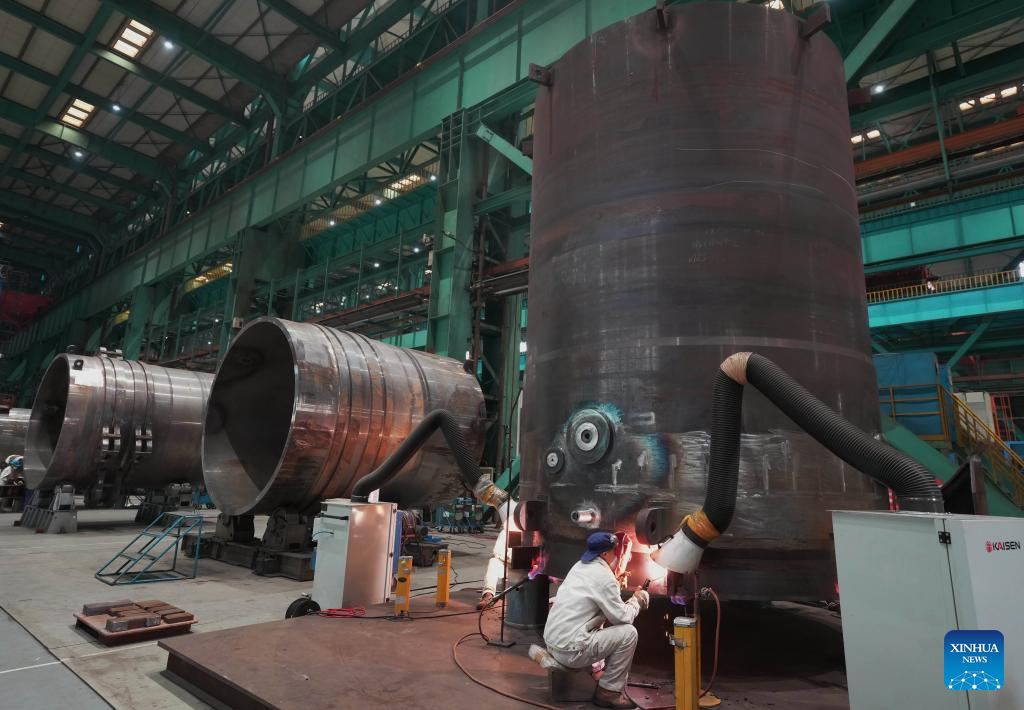 A man works at the workshop of a heavy equipment manufacturing company in the Qinhuangdao Economic and Technological Development Zone, north China's Hebei Province, Nov. 5, 2023.?(Xinhua/Yang Shiyao)