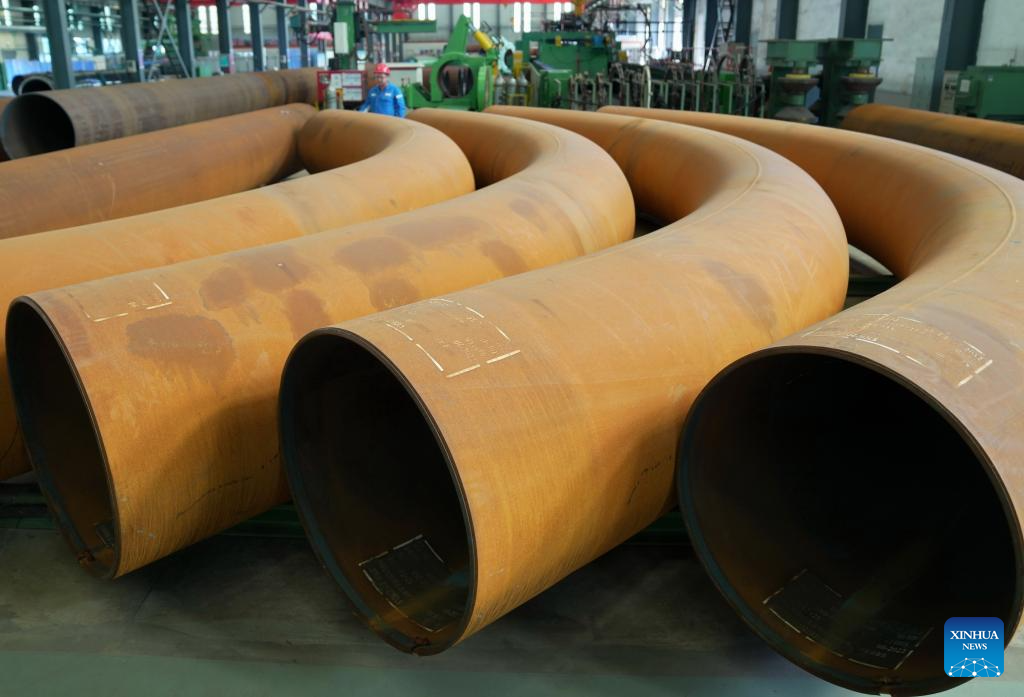 A man works at the workshop of a steel pipe manufacturing company in the Qinhuangdao Economic and Technological Development Zone, north China's Hebei Province, Nov. 5, 2023.?(Xinhua/Yang Shiyao)