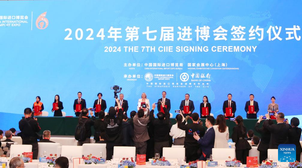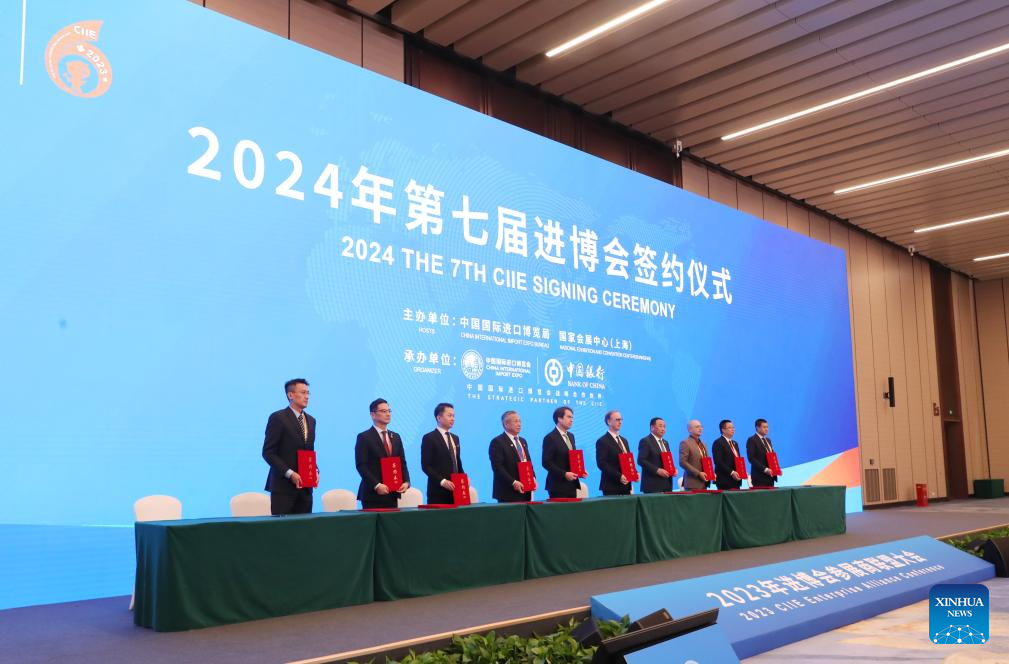 The signing ceremony of the 7th China International Import Expo (CIIE) is held at the National Exhibition and Convention Center (Shanghai) on Nov. 6, 2023. The first batch of 65 enterprises have signed contracts in Shanghai on Monday to participate in the 7th CIIE in 2024. (Xinhua/Fang Zhe)