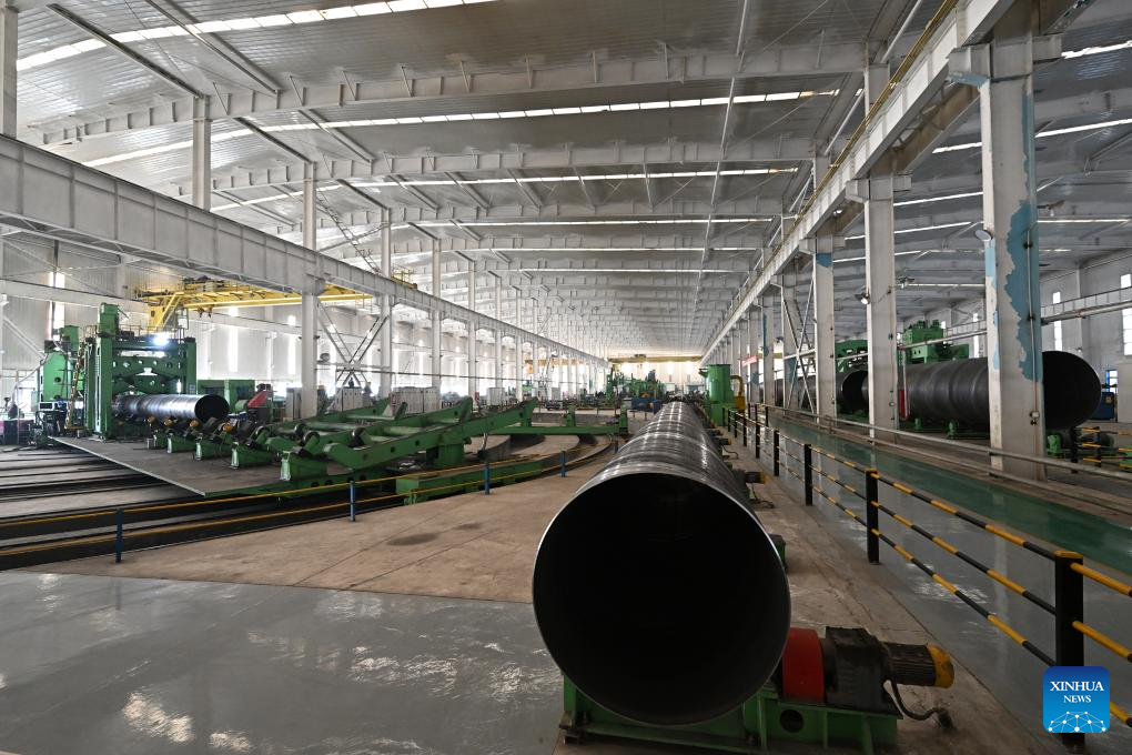 This photo taken on Nov. 4, 2023 shows the workshop of an oil and gas pipeline company at the Alataw Pass in northwest China's Xinjiang Uygur Autonomous Region. Located in the Mongolian Autonomous Prefecture of Bortala in Xinjiang, the Alataw Pass borders Kazakhstan. Since 2011 when the first China-Europe freight train passed through it, the pass has handled more than 30,000 trains to Central Asia or Europe. (Xinhua/Li Xin)