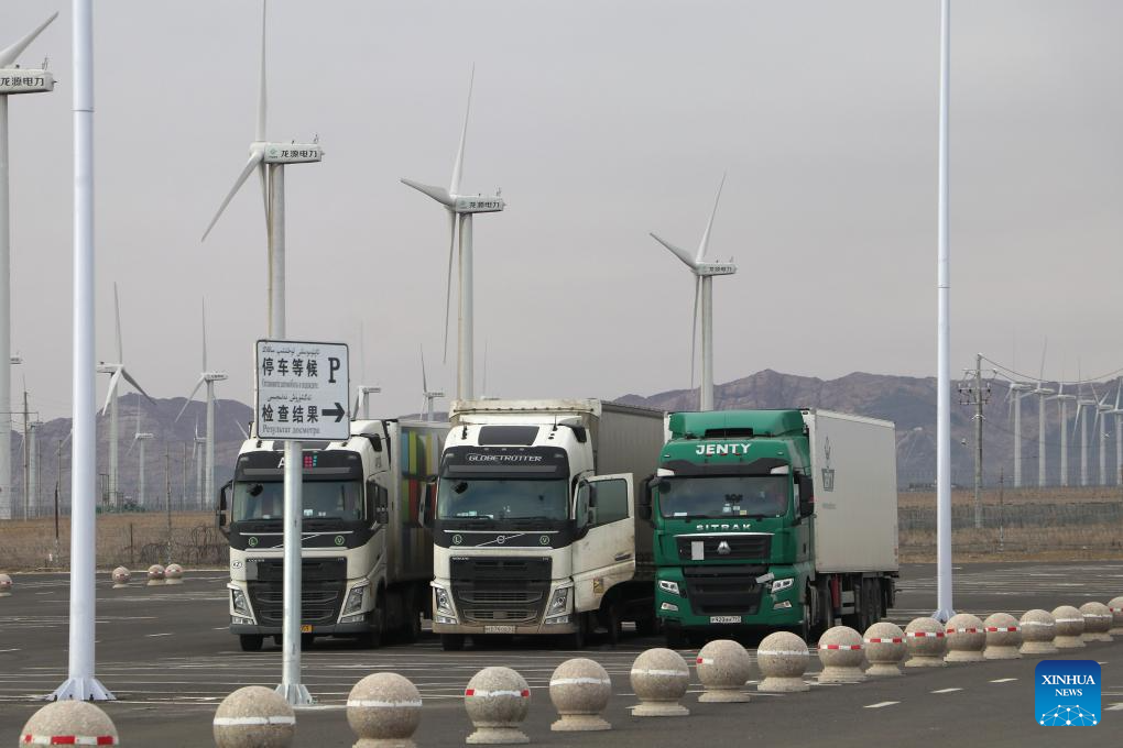 Foreign trucks wait for the results of examination at the Alataw Pass in northwest China's Xinjiang Uygur Autonomous Region, Nov. 5, 2023. Located in the Mongolian Autonomous Prefecture of Bortala in Xinjiang, the Alataw Pass borders Kazakhstan. Since 2011 when the first China-Europe freight train passed through it, the pass has handled more than 30,000 trains to Central Asia or Europe. (Xinhua/Zhao Chenjie)