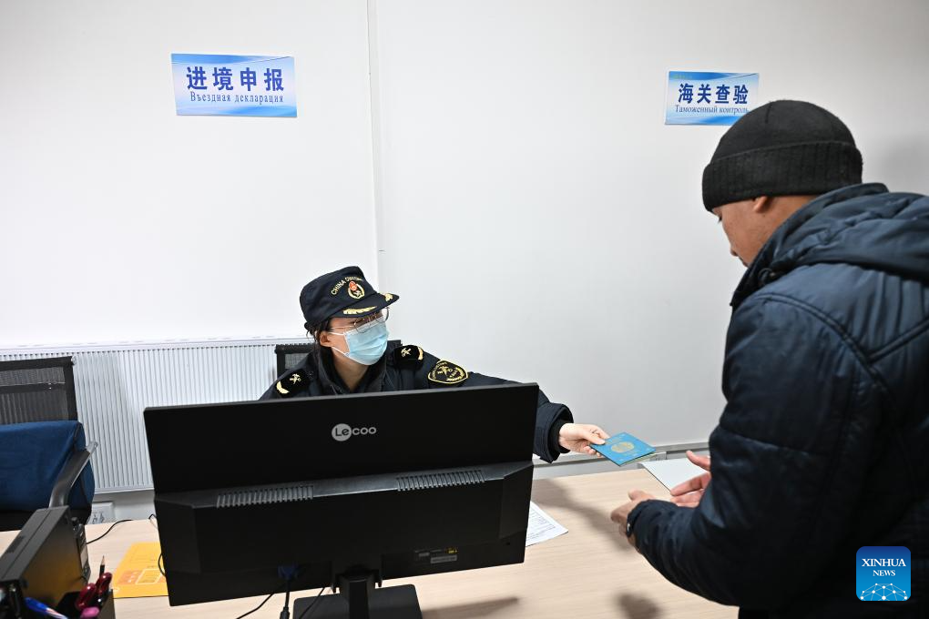 A foreign driver applies for entering China at the customs of Alataw Pass in northwest China's Xinjiang Uygur Autonomous Region, Nov. 5, 2023. Located in the Mongolian Autonomous Prefecture of Bortala in Xinjiang, the Alataw Pass borders Kazakhstan. Since 2011 when the first China-Europe freight train passed through it, the pass has handled more than 30,000 trains to Central Asia or Europe. (Xinhua/Li Xin)