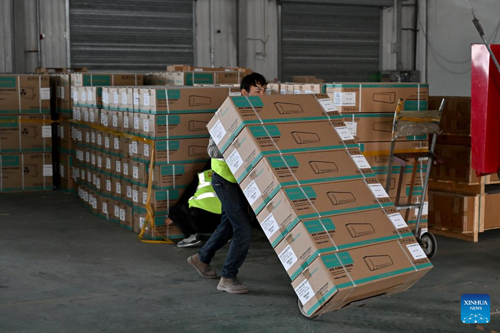Workers prepare to load domestically produced air conditioners onto trucks at the custom clearance center for the cross-border e-commerce of the Alataw Pass comprehensive bonded area in northwest China's Xinjiang Uygur Autonomous Region, Nov. 4, 2023. Located in the Mongolian Autonomous Prefecture of Bortala in Xinjiang, the Alataw Pass borders Kazakhstan. Since 2011 when the first China-Europe freight train passed through it, the pass has handled more than 30,000 trains to Central Asia or Europe. (Xinhua/Li Xin)