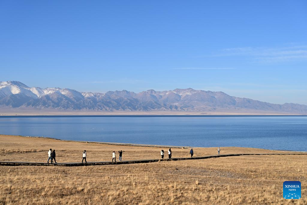 Tourists visit Sayram Lake in Bortala Mongolian Autonomous Prefecture, northwest China's Xinjiang Uygur Autonomous Region, Nov. 6, 2023. Sayram Lake is the largest and highest alpine lake in Xinjiang. (Xinhua/Li Xin)