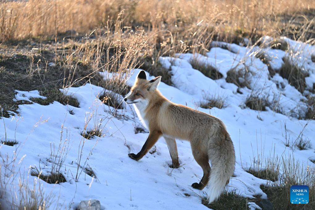 A fox is pictured by Sayram Lake in Bortala Mongolian Autonomous Prefecture, northwest China's Xinjiang Uygur Autonomous Region, Nov. 6, 2023. Sayram Lake is the largest and highest alpine lake in Xinjiang. (Xinhua/Li Xin)