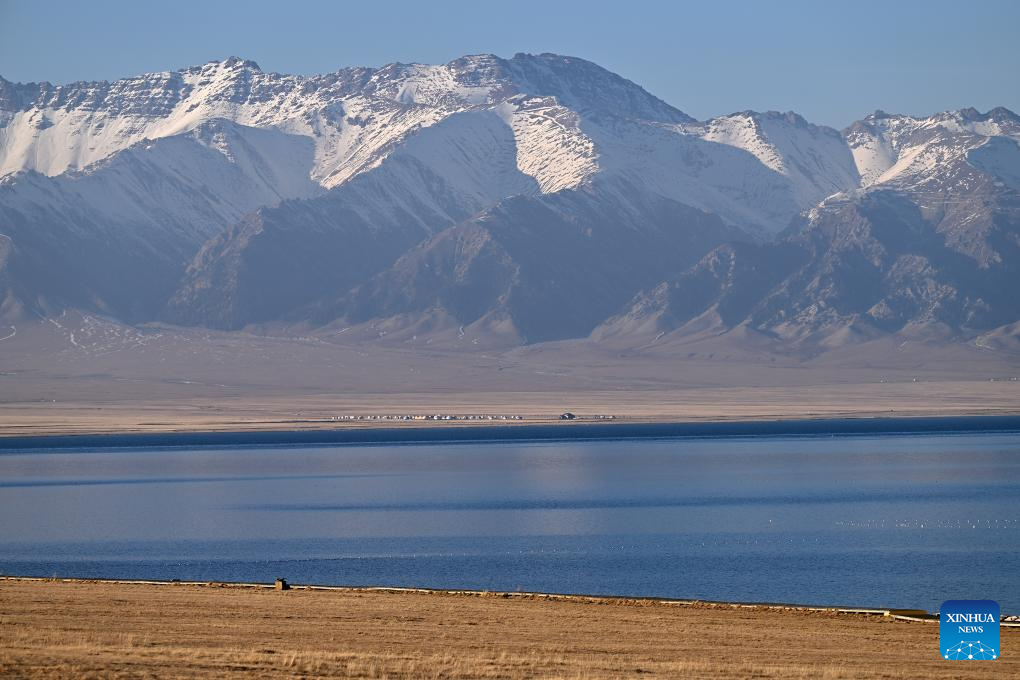 This aerial photo taken on Nov. 6, 2023 shows a view of Sayram Lake in Bortala Mongolian Autonomous Prefecture, northwest China's Xinjiang Uygur Autonomous Region. Sayram Lake is the largest and highest alpine lake in Xinjiang. (Xinhua/Li Xin)