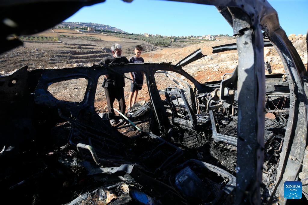 Local residents stand by the wreckage of a car that was bombed by an Israeli drone in Ainatha, Lebanon, Nov. 6, 2023. (Photo by Ali Hashisho/Xinhua)