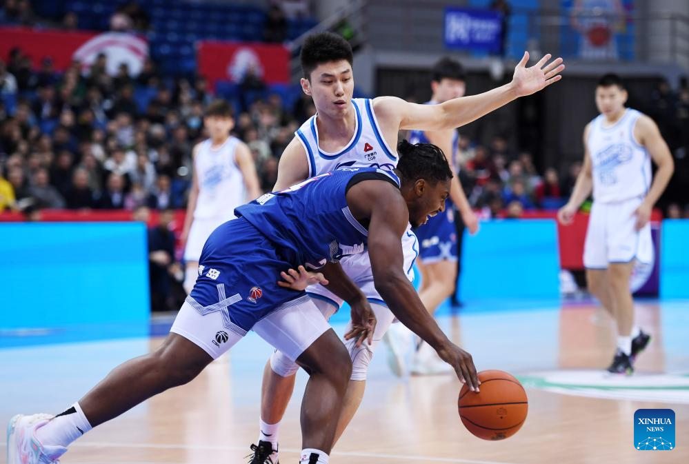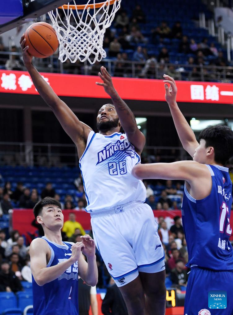 Akil Mitchell (C) of Ningbo Rockets competes during the 7th round match between Qingdao Eagles and Ningbo Rockets at 2023-2024 season of the Chinese Basketball Association (CBA) league in Qingdao, east China's Shandong Province, Nov. 7, 2023. (Xinhua/Li Ziheng)