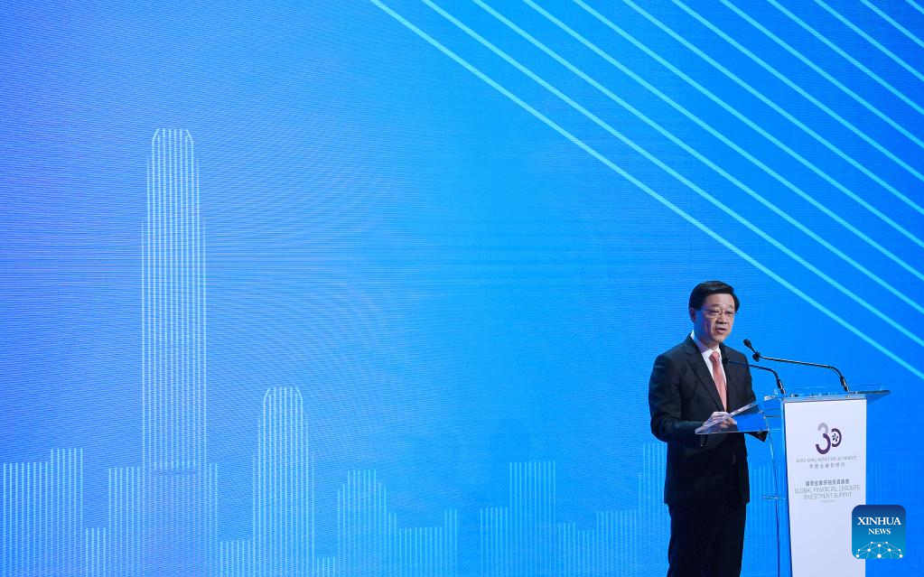 John Lee, chief executive of the Hong Kong Special Administrative Region (HKSAR), addresses the main session of the Global Financial Leaders' Investment Summit in Hong Kong, south China, Nov. 7, 2023. (Xinhua/Chen Duo)