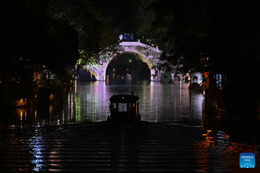 This photo taken on Nov. 7, 2023 shows a night view of river town Wuzhen, east China's Zhejiang Province. (Xinhua/Huang Zongzhi)